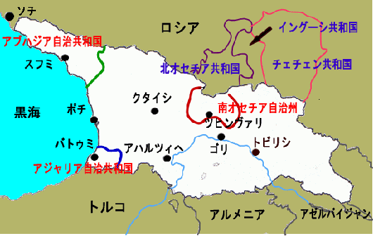 南オセチアがグルジアからの分離と北オセチアとの統合を求め、南オセチア-グルジア間、グルジア-ロシア間で紛争・武力衝突が起こっている問題。 |